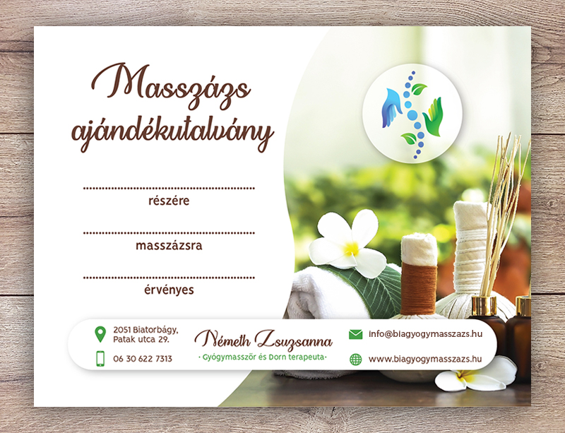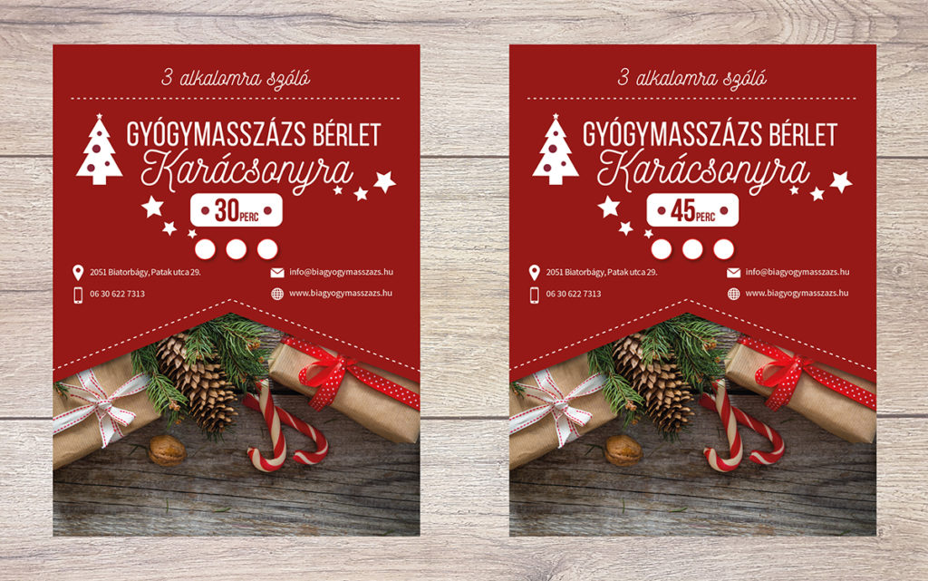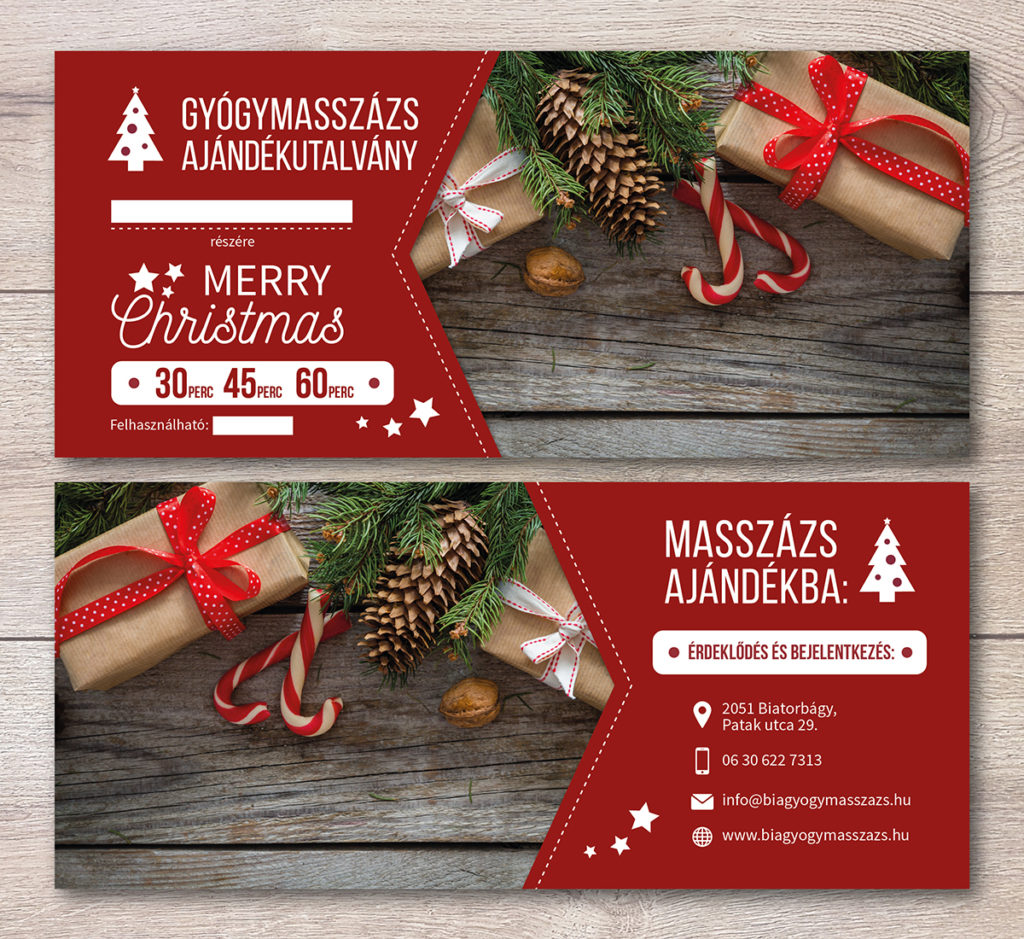 Karácsony közeledtével vásárolható masszázs utalvány, mely szabadon ajándékozható! A masszázs ajándékutalvány értéke megegyezik az árlistában feltüntetett árakkal és a kiállítástól számított három hónapon belül érvényes. Utalványok bérlet formájában (45′ 60′) is megvásárolhatók, 5 vagy 10 alkalmas kezelést tartalmaznak.
